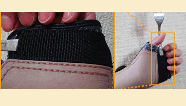 福岡県飯塚総合脊損センターの患者様に多く使用されている指をループにひっかけてベルクロをつけるループタイプです。 推奨障害レベル→C6~C8
