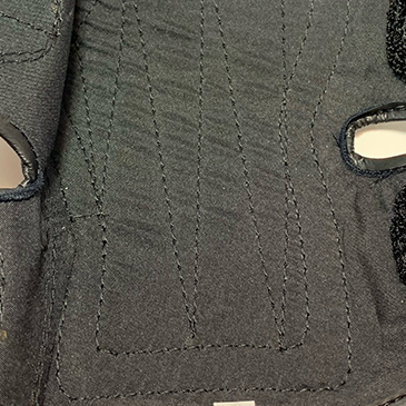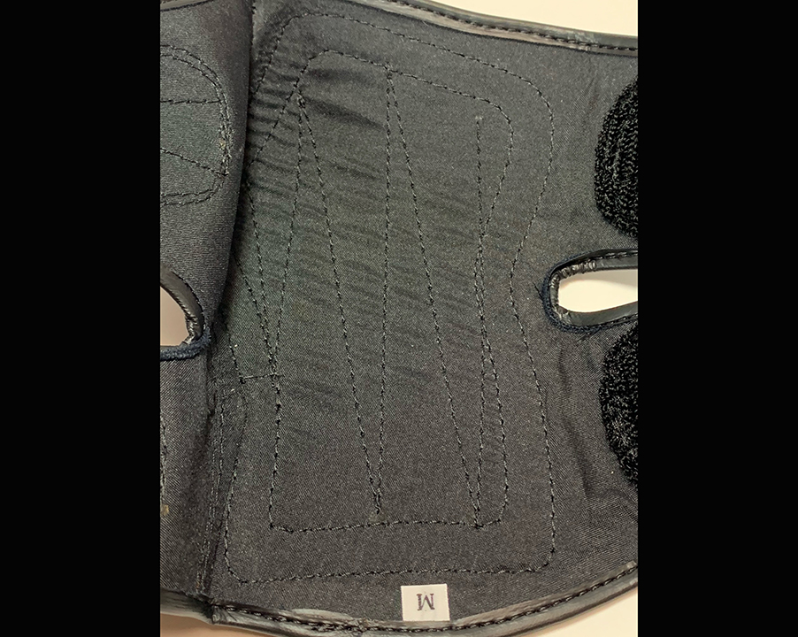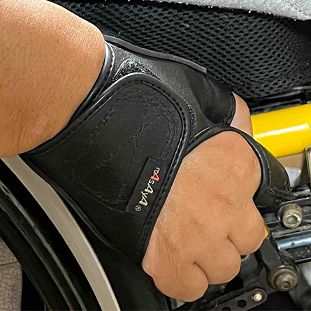 頚椎損傷者にとっては車椅子グローブが靴代わりでもあります。装着している時間が基本的に長い為、デザインはもちろんのこと、装着時の爽快感や手の蒸れや汗などを中生地で吸収し清潔さを追及しました。グローブの手のひら部分には、すべり止めの生ゴムを装着しております。(ゴム無しでも可能)